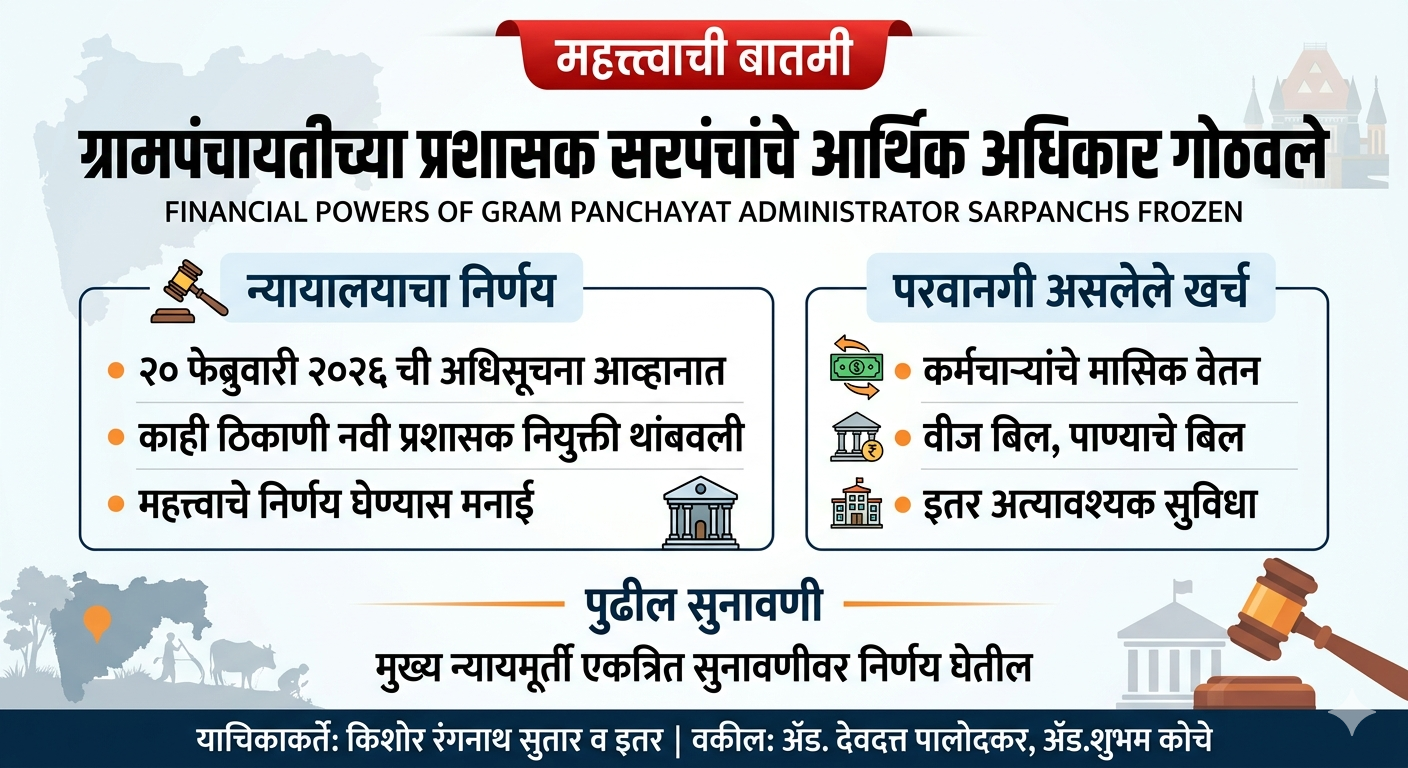 राज्यातील हजारो ग्रामपंचायतींची मुदत फेब्रुवारी अखेरीस संपल्याने, निवडणुकीचा कार्यक्रम जाहीर होईपर्यंत गावाचा कारभार विस्कळीत होऊ नये म्हणून सरकारने सहा महिन्यांची मुदतवाढ (Extension) दिली होती. जिल्हा परिषदेच्या मुख्य कार्यकारी अधिकाऱ्यांमार्फत (CEO) ही प्रशासक समिती नेमण्याचे अधिकार देण्यात आले होते. मात्र, आता न्यायालयाच्या हस्तक्षेपामुळे या ‘प्रशासक’ सरपंचांचे हात तांत्रिकदृष्ट्या बांधले गेले आहेत. या प्रकरणात याचिकाकर्त्यांतर्फे ॲड. देवदत्त पालोदकर आणि ॲड. शुभम कोचे यांनी बाजू मांडली.