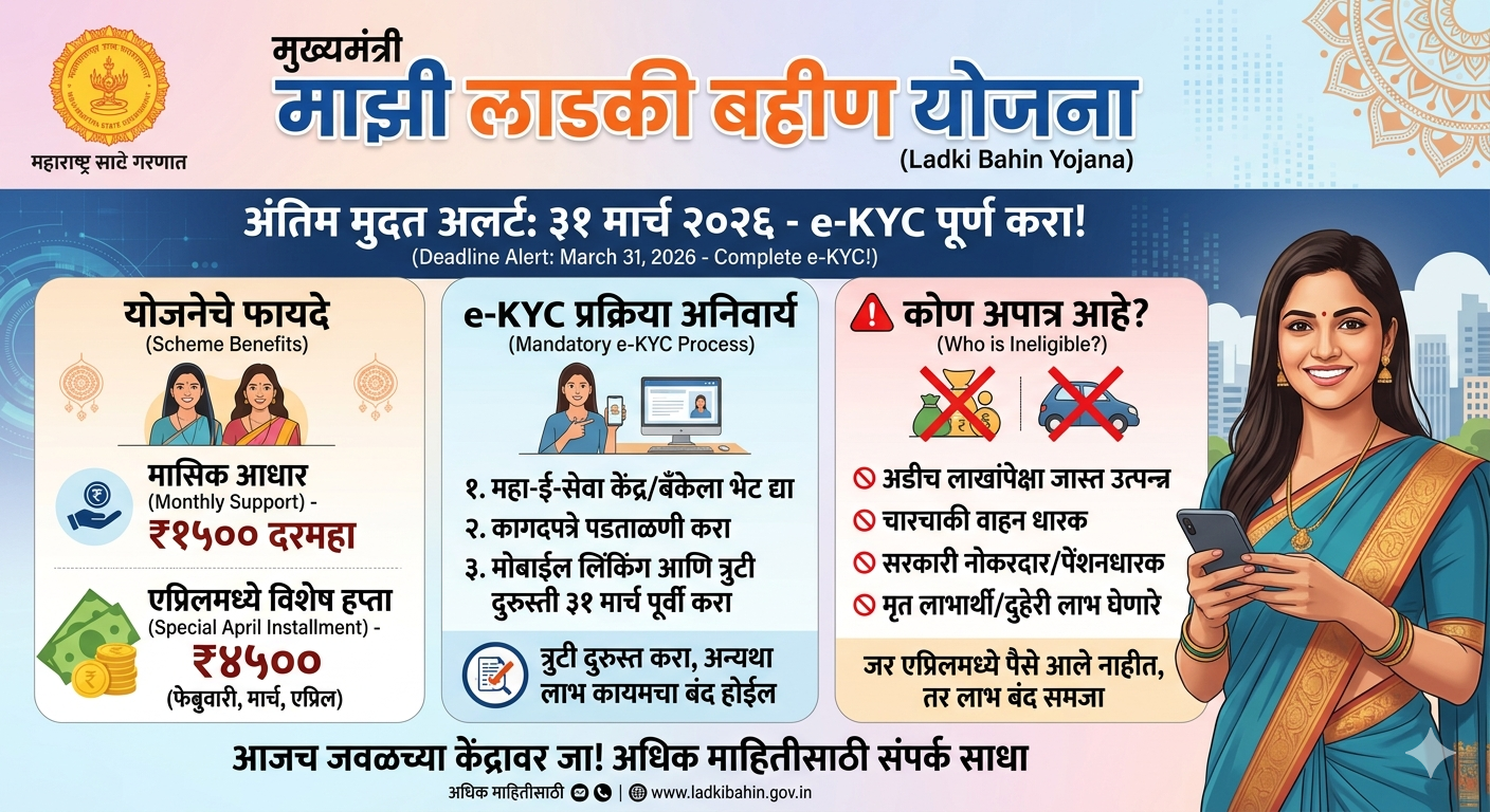 ज्या महिलांनी अद्याप ई-केवायसी (e-KYC) पूर्ण केलेली नाही किंवा ज्यांच्या अर्जात त्रुटी आहेत, त्यांच्यासाठी ३१ मार्च २०२६ ही शेवटची संधी आहे.