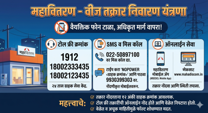 तक्रार नोंदवताना आपला 12 अंकी ग्राहक क्रमांक दिल्यास यंत्रणेला नेमका फॉल्ट शोधणे सोपे जाते. ऑनलाईन तक्रार नोंदवल्यास ती थेट संबंधित शाखेकडे वर्ग होते आणि वीज नियामक आयोगाच्या नियमांनुसार ती वेळेत सोडवणे महावितरणला बंधनकारक असते.