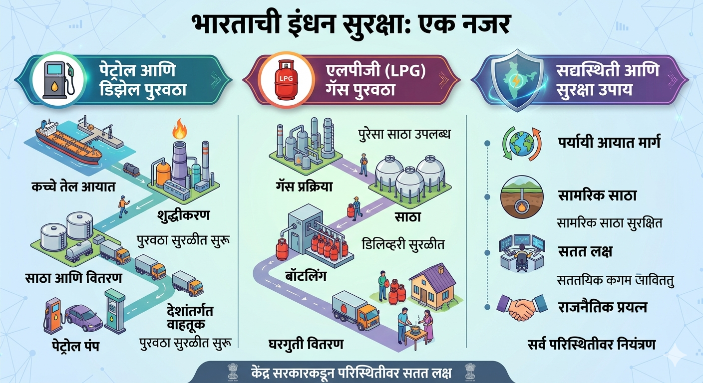 • इंधन पुरवठा सुरक्षित: देशात पेट्रोल, डिझेल आणि एलपीजी (LPG) चा पुरेसा साठा उपलब्ध आहे. काही भागांत दिसणारी टंचाई ही केवळ ‘सप्लाय चेन’मधील तांत्रिक अडचणींमुळे असून पुरवठा सुरळीत सुरू आहे.