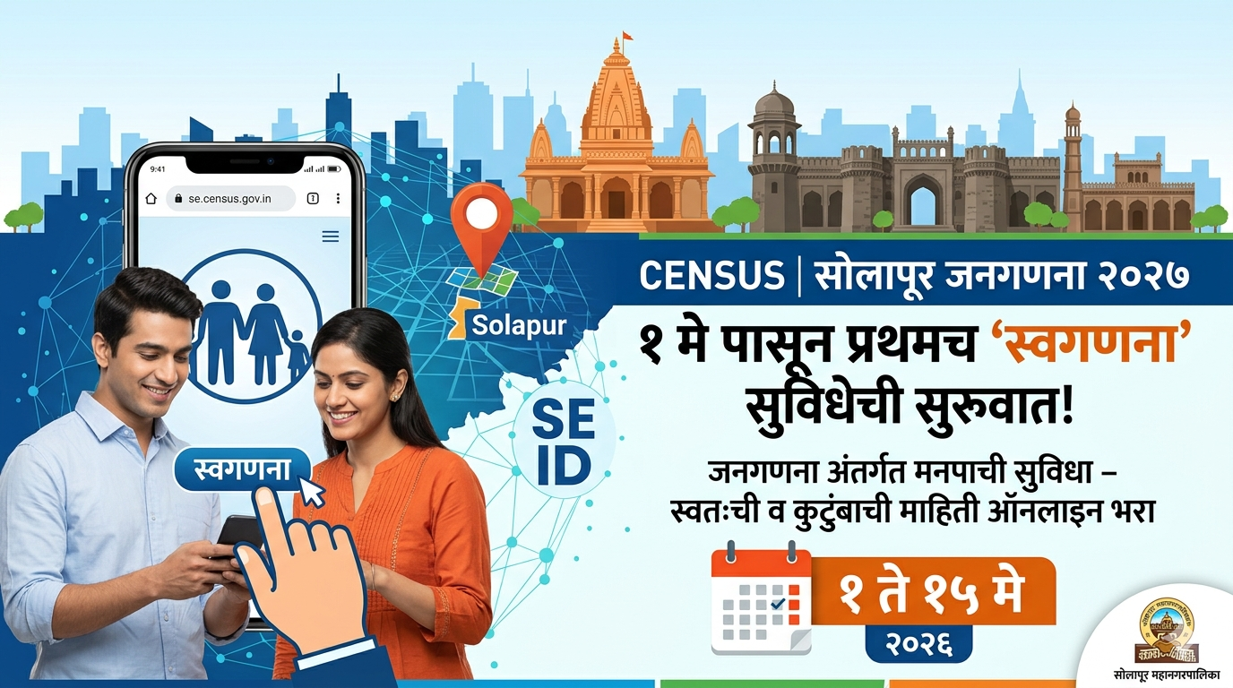 सोलापूर,दि.२६: भारत सरकारच्या जनगणना २०२७ (Census 2027) या महत्त्वपूर्ण मोहिमेअंतर्गत नागरिकांसाठी प्रथमच स्वगणना (Self-Enumeration) ही विशेष डिजिटल सुविधा उपलब्ध करून देण्यात आली आहे. या सुविधेद्वारे सोलापूरकरांना स्वतःची आणि कुटुंबाची माहिती ऑनलाइन पद्धतीने नोंदवता येणार आहे. ही प्रक्रिया १ ते १५ मे २०२६ या मर्यादित कालावधीत राबवली जाणार असल्याची माहिती महापालिका आयुक्त डॉ. सचिन ओम्बासे यांनी दिली आहे. (Solapur Census)