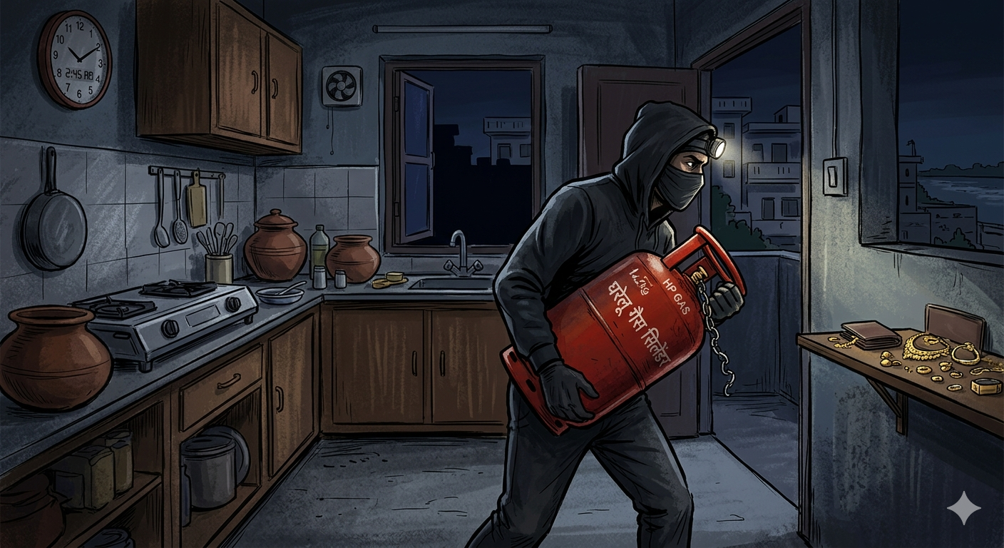 प्रयागराजच्या त्रिवेणी बांध परिसरात राहणारे ज्ञानचंद्र शनिवारी रात्री आपल्या कुटुंबासह गाढ झोपेत होते. मध्यरात्री चोरांनी त्यांच्या घरात प्रवेश केला. कपाटातील दागिने किंवा महागड्या वस्तूंऐवजी चोरांनी थेट स्वयंपाकघर गाठले आणि तिथून गॅस सिलिंडर लंपास केला.